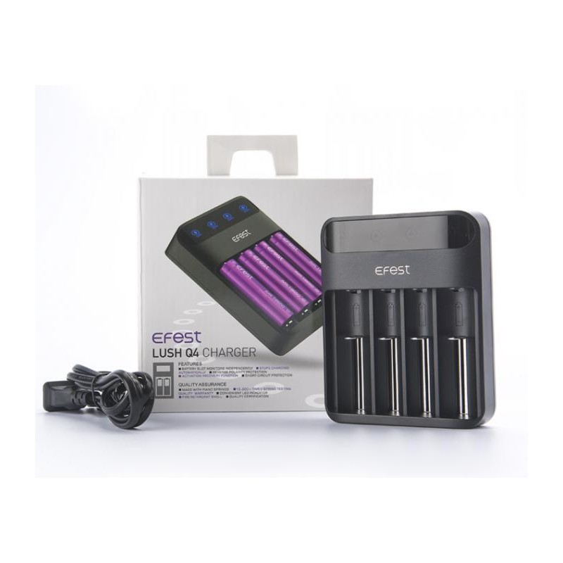 Φορτίστε τις μπαταρίες σας με τον Efest Lush Q4. Είναι ένας φορτιστής 4 θέσεων που αυτόματα φορτίζει με γρήγορη φόρτιση 2.0A μια μπαταρία, 1.0Α δυο μπαταρίες και 0.5Α 4 μπαταρίες. Έχει εύκολο σχεδιασμό χωρίς κουμπιά με ένδειξη LED που δείχνει την κατάσταση φόρτισης της μπαταρίας. Κάθε θέση είναι αυτόνομη για να γίνεται η πιο αποδοτική φόρτιση. Μπορεί να φορτίσει διαφορετικών τύπων 3.6V/3.7V μπαταρίες λιθίου.
